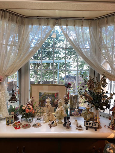 入り口に入ると、素敵な庭とフラワーガーデンが現れます。お店の中に、アンティーク風家具やフランス人形、絵、綺麗に飾っていて、とてもエレガントな雰囲気でした。