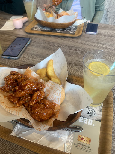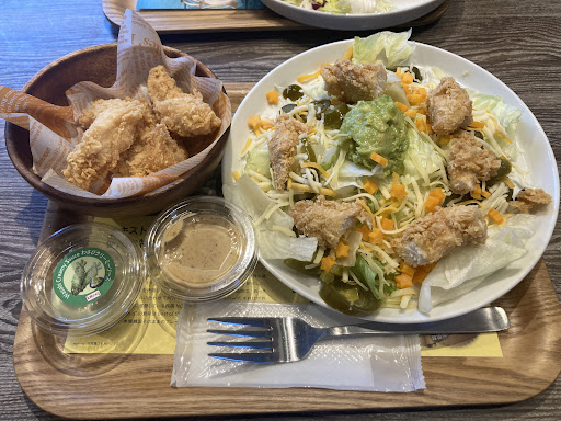 バターチキンカレー メキシカンチキンサラダ LINEアンケートでオリーブチキンフィンガー を注文。 メキシカンサラダは胡麻ドレッシングで、チーズやハラペーニョが入ってチキンも乗っているので食べ応えがあります。 ハラペーニョを避ければ子供でも食べられそうです。 チキンカレーの方は、添えられたサラダにラディッシュピクルスが入っていました。 五穀ご飯ですが、味は白米に近く癖がないのでカレーの邪魔をしません。 フィンガーチキンは、ソースがヤンニョムやわさびやチーズなど5種類くらいから選べました。 あと、印象的なのが店内飲食よりテイクアウトで買っていかれるお客さんが多いと感じられました。 不慣れでしたが、男性の店員さんの対応が親切でとてもよかったです。 ごちそうさまでした。