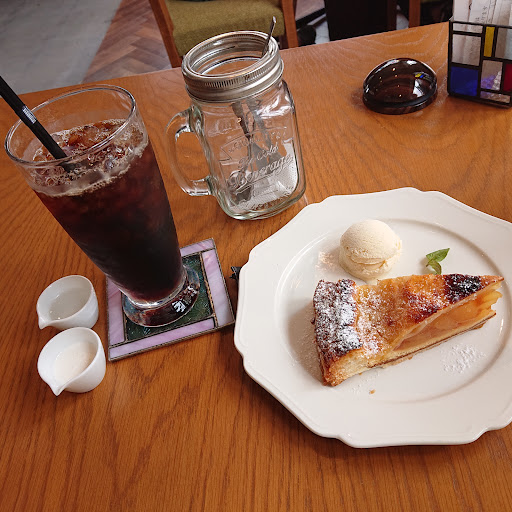 Read moreコロナの影響でずっと閉められていて、やっと開店。ずっと気になっており、本日初めて来店しました。 店内のあちこちに素敵なステンドグラスのランプが席にあり、一つ一つ模様が違い目を楽しませてくれます。 また、ウッド調のインテリアで落ち着いた感じでした。コロナの影響なのか?四人席のテーブルが二人席になっていて一方向を向いて座るようになっていました。これはこれで今だけの席なのかな、と思いますが、新鮮で良かったです。店内はwifiフリーで、ドリンクはどれも二杯目は半額とありました。(二杯目は時間がなかったので頼みませんでした。) アイスコーヒーとアップルパイを注文しましたが、スタッフさんがまだ接客に慣れていないのか、席に案内された後にお水&おしぼり&荷物入れを忘れていたり、注文の品数を間違えたり……と、色々ありました(笑)なので、お味は☆4つでしたが、お店の評価は☆3つにしました……(^^; 珈琲は注文が入ってドリップで入れるみたいで少々待ちますが、苦味がきいていて最後までとても美味しく飲めました。(ちなみにアイスコーヒーのミルク&シロップも忘れていました………(^_^;)アップルパイはパイ生地がサクッと切れて優しいお味の甘さで温かく、アイスクリームは少し小さいですが、バニラビーンズ入りのミルクアイスでこちらも爽やかな甘味で冷たく美味しかったです。ランチもされているみたいなので、今度はランチも頂きたいと思います。...