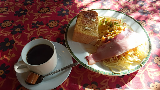 懐かしい雰囲気の喫茶店。 ドリンクメニューは少な目。 モーニングのブランチセットを食べました。 モーニングのパンは4種類から選べます。悩んで胚芽パンにしました。 ブランチセットはハムかベーコン、スクランブルエッグか目玉焼きが選べます。ベーコンとスクランブルエッグを選びました。 ミートソースがかかったパスタの上に、ベーコンとスクランブルエッグが豪快に載っています。 ベーコンはカリカリではなく、しっとり柔らかい感じです。 パスタはこしがあっておいしい。ミートソース、スクランブルエッグと相性抜群です。 パンも素朴な感じでおいしい。 朝からお...