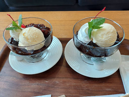 コーヒーゼリーを注文したのですが、あんこ、アイスクリームがのっている珍しい組み合わせ。