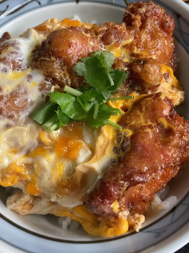 国道49号線沿いに建つ老舗食堂 数々の評判メニューからからあげ丼チョイス こんがりきつね色のからあげに半熟とじ 香り立つ丼にしみ入る甘塩っぱいタレ 嗚呼花も嵐もタレしみメシをかっこみて