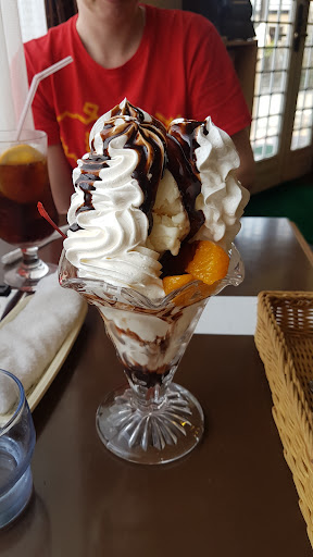 次はパフェの登場です。なかなかの大きさです。 真ん中にバニラアイスが3~4段重ねてあり、その周りにクリームがデコレーションされています。 クリームはさっぱりとした甘さでくどくなく非常においしいです。アイスと良く合います。チョコソースがもう少し多いと良いかな?と思いましたが、最後までおいしく完食しました。 また来たいと思います。