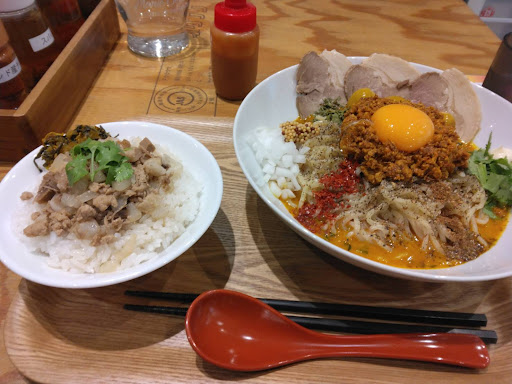 ラーメンとしてもカレーとしてもご飯としても肉料理としても最高レベルで、スパイスとハーブのシビれるような旨辛でとても幸せな気分になりました。そして店内が清潔でオシャレで雰囲気も良いです。南東北(特に会津)はラーメン激戦区で、異端なものは流行りませんが、このバランスは初めて出逢う味で、リピート確定です。一つ一つ詳細に説明すると、 ◎キーマやルーロー飯の肉が単なる挽肉や角切り肉ではなく、それらが絶妙なバランスでミックスされている。 ◎ルーロー飯やチャーシューの肉、うずら卵が丁寧に仕込まれていて、味わい深い。 ◎八角の主張が強すぎない(若干、カルダモンの主張が強めでカルダモンの繊維が残るくらいなのは好みが分かれますが、カルダモンLOVEの僕には最&高)。 ◎ご飯の炊き方が本当に上手で、ルーローの汁と一緒でもベタつかない。 ◎まぜそばのスープ自体は塩辛くないが、キーマと他の具材の味が効いていてバランスが取れていてとても丁度いい。 ◎お水のボトルはじめ、お店の雰囲気がとてもオシャレ。 ◎駐車場にも余裕がある。 ◎お店の人にも清潔感があり接客が丁寧で、ホスピタリティをとても感じる。 リピート確定です。