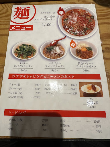 Read moreマップを見ていたらすごい高評価のラーメン屋さんがあるので行ってみました。 注文したのは旨辛スパイシーラーメンの特盛みたいなやつ! 2辛にしましたがインドカレーの2辛と体感同じです。ココイチ2辛よりは辛くないです。 普通に辛味好き程度なら2でいいと思います。後々効いてきますので。 麺は卵ちじれ麺というよりはうねってる?程度のウェーブ卵麺でした。 スープは豚骨系 意外にもチャーシューは普通に?いえ普通以上に美味しかった。スパイス感は感じませんでした。 背脂プルプルがちりばめられているけれどオイル感はあまりなく万人うけするラーメンでした。 ここで終われば評価4くらいのまぁまぁ美味しいラーメン屋さんです。 この上にかかっていたのが自作カレーなんかで使われる様々なスパイス! あとパクチー(パクチーはスープに沈めれば嫌な香りが飛びますので誰でも食べられます。) めちゃくちゃスパイシーで鼻水と汗が噴き出てきました。 おいしさだけでなくなんとなく元気が出た気がしました!(評価5) スパイスカレー好きなら一度入った方がいいです! 嫌いならやめた方がいいです。 大量のスパイスを使用されているので値段が少し高いのは仕方ないと思われます。 水までクラフトコーラのようなほのかな後味を感じました。 スパイス味玉はすご...