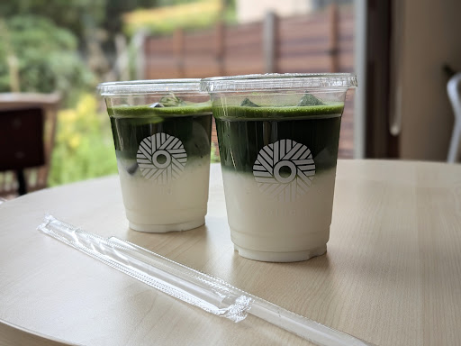 抹茶ラテ: グラデーションが芸術的。作りたては抹茶と牛乳が分かれているので抹茶のみで飲んでみてください。点てたばかりの抹茶を堪能できますよ笑。次によく混ぜてください。濃厚な抹茶と甘みを感じる牛乳のハーモニーが最高すぎます!!