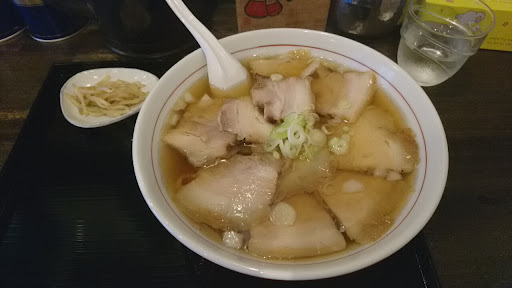 ○ここからメイン。 店内に入ると綺麗な女性店員さんに誘導され、ボッチなのでカウンター席へ。 その時の厨房には、イケメン風なニーチャン店員さんと、強面な感じのイケメン店長が。 醤油ラーメンを注文しました。 注文を待ってる間はスマホとにらめっこ! すると、多分車に何かを忘れたから取って来てテーブル席に戻ったであろうおっちゃん(客)が。 すると、強面イケメン店長さんがその客をガンッ見!……ずっと。私も気になってその客見ちゃうほど。私が視線戻しても、まだガンッ見!!私もまた気になって二度見! その視線だけで相手を倒せてしまいそうな鋭い眼光!かっこいいっす! ですが、私は中二病を拗らせてるわけではないので、これは流石に気になっちゃいます。 知り合いが 「「坂内のラーメンでチャーシューがただ丸いだけじゃん」と友達が言ったら店長さんに聞こえてて、腕組んでずっと見られてた。」 と言っていたのを思い出して。少し凄く怖くなりました(←どっち?)。 気に入らない客が来たら、いつかぶん殴ったりしないよね?と。 そうビクビクしていたら、注文した醤油ラーメンが私の元へ。 ビクビクしながらスープをひと口。「んお?おお坂内っぽい」と心の中で。 口に出したら殺られる!かも?と思い。 次はチャーシューを「おうっふっ。柔らかい♪坂内とは全然違う柔らかさや~♪味は無いけど」とやはり心の中で。 ですが、ビクビクしながらなので後の事は覚えてません。一刻も早くその店を出たくなってしまったので。だって怖いもの。 ここのイケメン店長は接客には向いてないように感じました。 今では喜多方ラーメンの代表的にもなった(ブランドと確立されそうな?された?)人気店坂内食堂の親族(?)である事から、「ラーメンは提供してやるが、接客までサービスしないぞ。俺は、ラーメンは作る」というように、提供と接客は別物に考えているように感じます。(※常連さんっぽい人にはよい感じでした) しかし、「接客態度が最悪!でも、あの味はまた食べに行きたい!それだけの価値がある!」というようなお店ならそれも許されるのでしょうが、ここの口コミを見るかぎりそうでもない(?)ような気がするので、心配なところです。