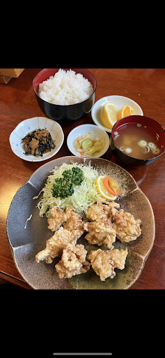 ・鳥の唐揚げ定食 ⏩カラリとしっかり目に揚げられたとりからちゃん♡サイズ的には大きくはないですが、ジューシーなお肉🤤 私は衣がコーンスターチか米粉、片栗粉系の竜田揚げ的?サクッと軽めなやつが好きですが、たまにこういう王道の昔ながらの唐揚げ食べたくなる😍❤️