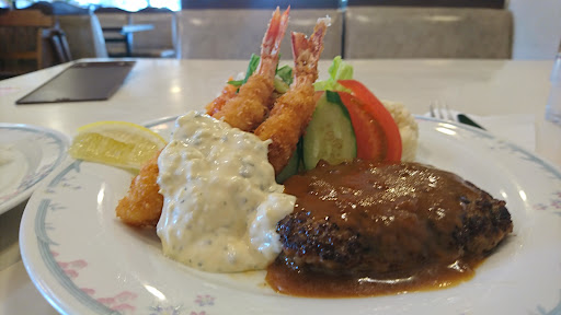 Read moreインターネット検索で見つけたお店です。メインストリートから少し入った場所にあり、いつも利用しているお客さんでないとわからない場所にあります。 ファミリーレストランと書いてありますが個人のお店にしてはかなり店内は広く感じました。入店しメニューを見るととても多くのメニューがあります。 ランチメニューも充実しています。 日替わりは人気なのか多くのお客さんがオーダーしていました。ご飯はお代わりOK。日替わりにはドリンクも付いているようです。私は悩んだ挙げ句、大好物のハンバーグとエビフライのセットをオーダー。エビフライにはタルタルソースがたっぷり乗っています。ハンバーグも美味しい。野菜もお皿にたっぷり乗っていますので、ヘルシーって感じです。しっかりとご飯もお代わり...