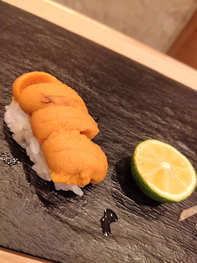 Read more由良赤ウニの季節が終わる前に食べに行こうという話になって急遽予約。 あてを含め、おまかせでお願いした。3才の息子には具なしのり巻きを作っていただき、お腹一杯になるまで食べさせていただいた。 大人はヒラメ刺身からはじまり、ホッキ貝、つぶ貝、ツバス、ハリイカげそボイル、伝助アナゴ等いただき、握りへの繋ぎに丁寧に処理されたイクラかけおちょこご飯。握りも定番の車エビ(生とボイル)、2種の蒸しアナゴのほかに、昆布締めマグロ、ハリイカ、根付アジ、サヨリ等バラエティにとんだ皆一仕事された一貫を十分味わって食した。 この日のウニは、大将が考案した赤ウニと馬糞ウニの合わせ盛り一貫、赤ウニは淡路の仕入れ先の工夫で木箱の臭いが着かないようにシートを敷いた上にパッケージングされたこだわりの素材。一方の馬糞ウニもみょうばん処理のされていない無添加品で、北海道からの輸送の衝撃に耐えられるように特別なケースに収納されたこちらもこだわり素材。二つが混ざりあって独特の甘味と後味を楽しめる。残念なのは口の中ですぐに溶けてなくなるので少ししか味わえない点。どんぶり一杯のウニご飯にしたらどんなことになるのか妄想を膨らませてしまう。 最後は奥さまのスイーツを頂いてお店を後にしましたが、隙のない最高のおもてなしと大将のホスピタリティー溢れる接客に大満足の2時間半があっという間に過ぎていった。 次に訪れるのはいつか、また楽しみにして待っていよ...