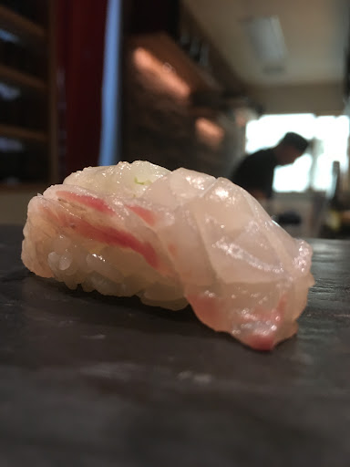 ○明石 しまあじ 明石5連打! アブラのノリはほどほどですが、かなりのぶりぶりな弾力。 爽やかでほろ苦い柚子皮のあしらいがとてもいい。