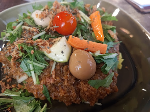 まずカレーについて お肉が手羽元だったのですが、とろとろのほろほろでスプーンで解れる柔らかさでした。バターチキンカレーだからか辛さはあまり無かったです。 ご飯は黄色いのでターメリックライスかサフランライスのようで、上にフライドオニオンが乗っていました。ルーと一緒に食べると、サクサクした食感が楽しかったです。 付け合せには自家製でしょうか?オクラ、トマト、ゴーヤ、うずらの卵のピクルス?と枝豆が添えてありました。最初見た時はゴーヤ!?と思いましたが、全然苦くなかったです。