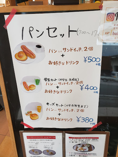 好きなパン二種類と飲み物つきでワンコイン。(税込540) 学生さんとか子供にはもっと低価格。好きなパンの中には サンドイッチとかも選べる。私は375円のサンドイッチと220円のガーリックトースト。