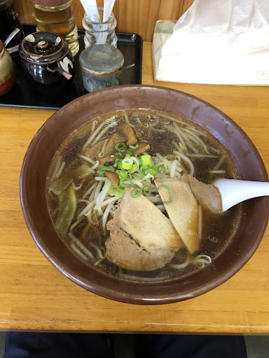 ラーメンはシャキシャキのもやし、チャーシュー、メンマ、ネギが乗っているシンプルな正油ラーメンです。スープは濃い目の味付けです、鰹節の香りがハッキリわかり美味しさが増します。スープの底に粉末が残っていたので、魚粉も入っているのかも。 テーブルには、にんにく、ラー油などあり味変もできるアイテムもあります。