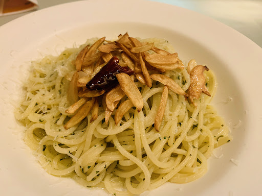 ペペロンチーノは、焦しニンニクが多めでこれがビールのお供に丁度いい(#^.^#) 本格的イタリアンのお店なので、パスタの太さや茹で加減も絶妙。バジルと細かく削られたチーズが良い隠し味となり、味に深みを加えてくれます。