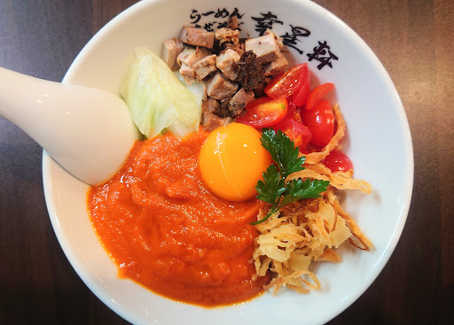 Read more夫婦で初めて入店。 お店の中が見えないので少し緊張しつつ引き戸を開けると、女性の「いらっしゃいませ」が聞こえて、なんか安心しました。 出入り口の食券で注文。 夫は和風まぜそば、私はトマトラーメン。 ランチ時の忙しい時間帯だったけど、2つとも10分以内で運ばれてきたと思います。 箱ティッシュも置いていってくれました。 トマトラーメン、おいしいおいしい!が止まらずペロリと完食。 トマトスープは酸味無く、少しドロリとしていて、ニンニクが効いてたのが素晴らしい。 麺は極細ストレート。 食べてる途中、白い服に赤い飛沫がとびましたが致し方なし。 スープ美味しかったなあ。 唐揚げも気になるし、チーズトマトラーメンも食べたいので、今度はトマト好きの子どもも連れて一緒に来店したいです。 食事中、衛生責任者の方のお名前と、器に書かれている店名見て、おおwそういうコトか...