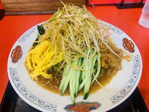 予想していた姿とは違いらがネギが三角山のように盛られていて、迫力十分(笑) 南蛮ラーメンと冷やし中華を上手くコラボしたラーメンですね。