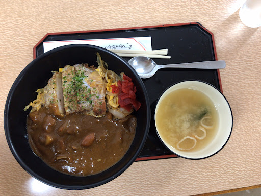 そして、静かにカレーカツ丼登場だ。 いわば、カツ丼とカレーのハーフアンドハーフだ。 カツ丼にカレーがかかってなくてよかった。 なぜならば、カレー味が全てを支配してしまうからです。