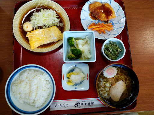 日替わり600円定食(今は消費税込み660円になりました) 行った時は 御飯 漬物 焼き魚 煮付け キャベツ千切り 卵焼き 切り干し大根 ミニラーメン でした。