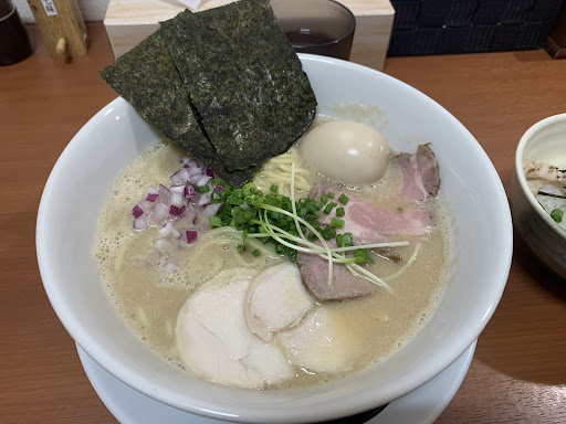 Read more6/12☆ 貝出汁とんこつ初めて頂きました! お出汁もきちんと感じるし、 とんこつもいるし、すごく 美味しかったです。チャーシューは鶏と豚。 鶏はしっとり柔らかで最高♩¨̮ 豚は友達にあげてしまいました🤣 しっかりめな味が好きですが、 途中からは味が濃すぎる気がして、 しょっぱく感じました💦 味玉付きでしたが、卵もまた、黄身が 思った以上に濃い味付けでした💦 友達は貝出汁塩ラーメン。これまた 貝出汁をすごく感じられて最高♩ 店舗自体は小さくて、店前の駐車 スペースは軽1台か2台まで停められます。 あとはすぐそばのコンビニ横に、 4台分くらいの駐車場ありました。 テーブルはなく、全てがカウンター席。 女性1人で来てる方もいて、店内は シンプルで清潔感ありました。 各席には荷物かけもあって、bagが あって...