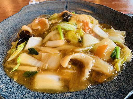 餡はとろみは豊か、甘さは抑え気味で上品な味。沢山の種類の野菜と豚肉に餡が絡まって、かなり美味しいい。