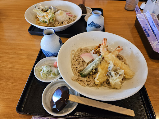 Read more昼に3人で訪れました。最初は冷水が運ばれ、お願いすると温かいお茶も持ってきていただいてサービス面はよかったです。 私が選んだ「冷やし天ぷらおろしそば1188円」はえび天2尾、大きいまいたけ天、オクラ天、たっぷり大根おろしにナメコと値段のわりに具だくさんでした。 「夫のぽん太君」は野菜おろしそばのそば大盛り1331円にしたら、ちょうどよい量だったそうです。 もう一人の同行者はメニューを見るなりミニうな丼ミニそばセット1892円を頼み、おいしそうに食べているのを見て、今日は南部屋敷に来てよかったと思いました。