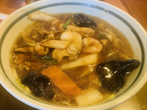 五目なので、具材がたっぷり。海老にイカ・ホタテ・キクラゲ・豚バラ肉・白菜・ニンジン・青梗菜が、これでもかと入ってます。どれもしっかり煮込まれ熱々で美味しい。