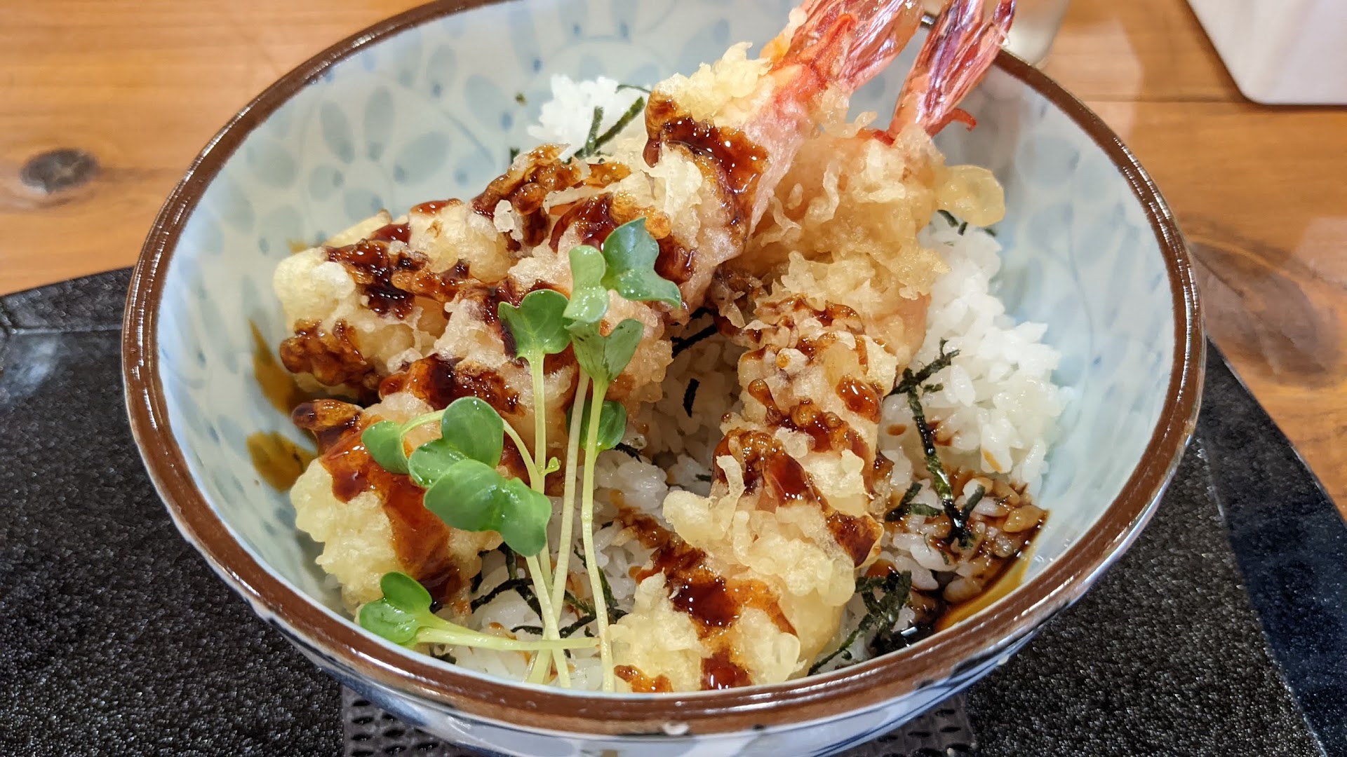 Read moreWe were looking for something quick and tasty, and figured that it's hard to go wrong with tendon. It was one of the pricier things on the menu, and while it tasted good and came out fast, the volume was disappointing... only three shrimps on rice with a small herb garnish. It's convenient when you're already here to shop for souvenirs, but don't go out...