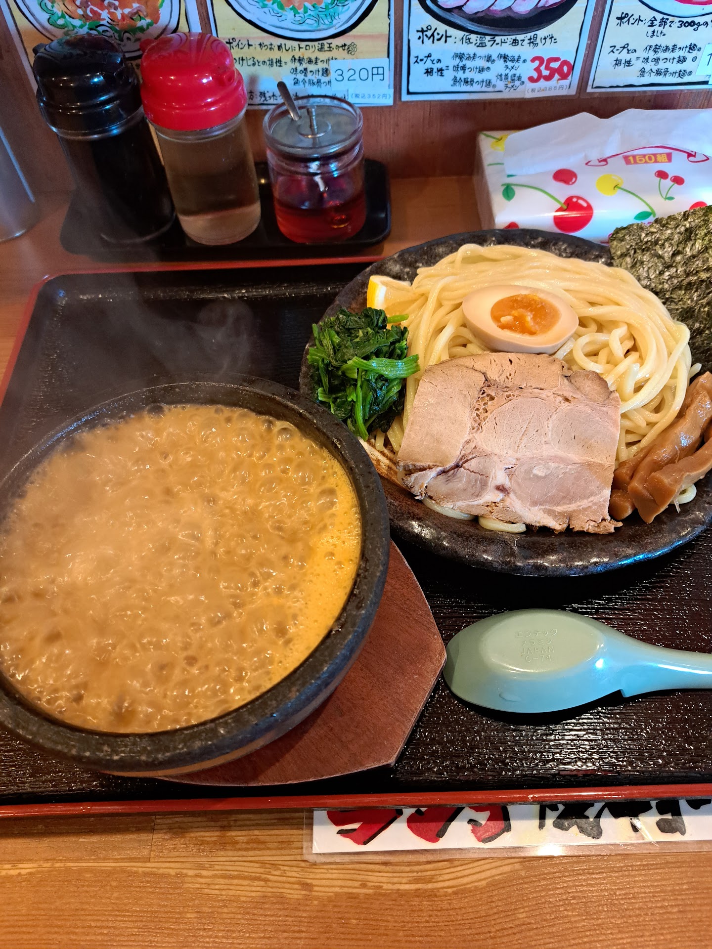 私は海老つけ麺(元味)肉増し特盛。 妻は海老つけ麺(味噌味)大盛。 義母は焙煎醤油ラーメン。 娘はお子様ラーメン(海老)。