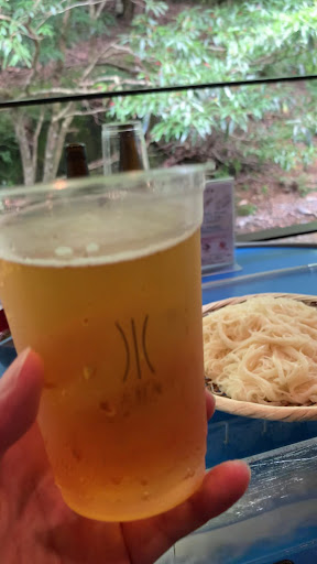 そうめんは揖保乃糸・黒帯。ゆで加減がサイコーで、冷たい水の中でクルクル流れます。地元で開発したつゆが合う。セットのアスパラ肉巻き、ニジマス塩焼き、タカエビだしのみそ汁、おにぎりは美味しいし、オプションで地鶏から揚げ、タカエビ刺身、やぶさめ地鶏の刺身をたのんだらサイコーでした。