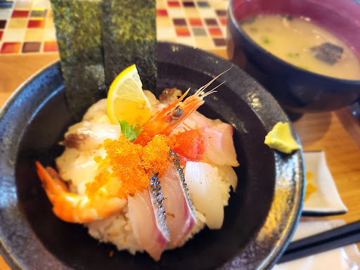 Read more120席とかなり広い店内で、平日でも混んでいましたが、10分もかからず提供は早めでした。座敷もあるので、子連れのお客さんも結構お見かけしました。 海鮮丼はタレがかかった状態で提供されており、味が足りなければ醤油をどうぞというスタイルでしたが、私はそのままで魚の味を楽しみました。新鮮で臭みがなく、流石漁師の食堂と言ったところ。 山芋とネタをのりで巻いたり、イカに明太子をあえながら食べたり、味変でお酢をかけたりとかなり楽しませていただきました。 驚きポイントはかなりデカイお味噌汁、普通の4倍以上はあると思います。中にあらが入っておりいい出汁が出ています。また、かなり脂の乗っているお魚を使われているようで、甘い油脂が浮いており温まります。私のお味噌汁にはかなり身の付いたあらが二塊入っており、定食のおかずの一品くらいのボリューム。連れのお味噌汁に入っていたのは、身が少なめだったらしく、くじと思って楽しみに...