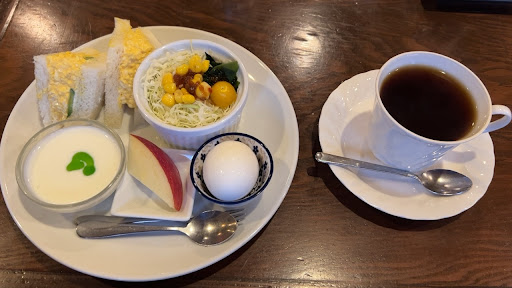 A surprisingly popular place! I arrive around 8:30 on a Saturday morning and it was FULL. Only had to wait 5 minutes for a spacious counter seat, but I rarely see retro cafes like this so completely full. The morning set is a good reason why. The one pictured was just ¥450 (February 2024) with the full pot of tea. You can choose regular white bread or brown sugar bread, and there are about 8 different toppings to choose from. Mine is just boring - but...