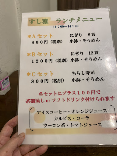 さて注文 ◆Aセット¥800税抜き (にぎら8貫、小鉢、そうめん) ◆プラス¥100で茶碗蒸しかソフトドリンク
