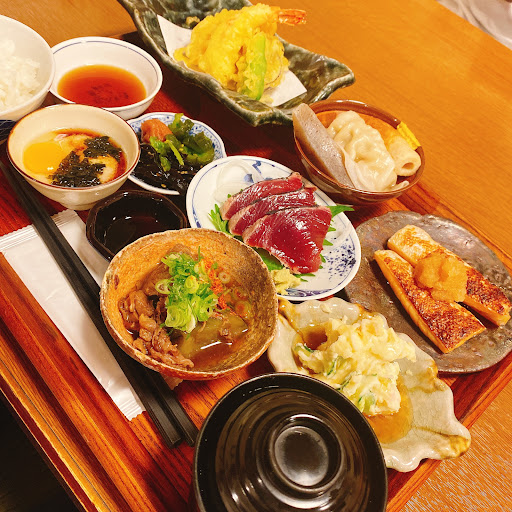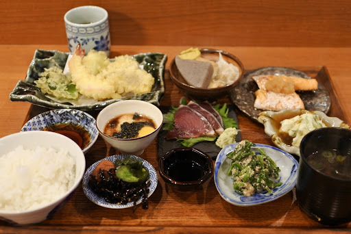 ◆昼の定食 税込 1,500円 大きなお盆に乗って出て来た料理は小鉢がぎっしり隙間なく置かれていてめちゃくちゃ美味しそう〜♪ 割烹料理店のプライドを感じるような魅力的なランチです。 良い店は基本がしっかりしてるから味噌汁が美味いはず!と真っ先に味噌汁を飲むとウマー! 天ぷらは海老、さつま芋、かぼちゃ、玉葱、大葉ですが揚げ方が上手くて衣がサクッと軽くて美味いっ。 おでんは蒟蒻、竹輪、厚揚げ、焼売ですがおでん出汁が美味しいから全部美味い〜♪ 家で作るおでんに焼売は入れないから参考になった。 焼き魚は鮭のハラス。 脂がノリノリで、鰹のタタキはさっぱりしてこれも美味しかった。 ポテサラに餡がかかってるのは珍しいなぁ。 他の料理もお漬物も含め全て美味しかったけど難点を挙げるとご飯が少ない事かな。