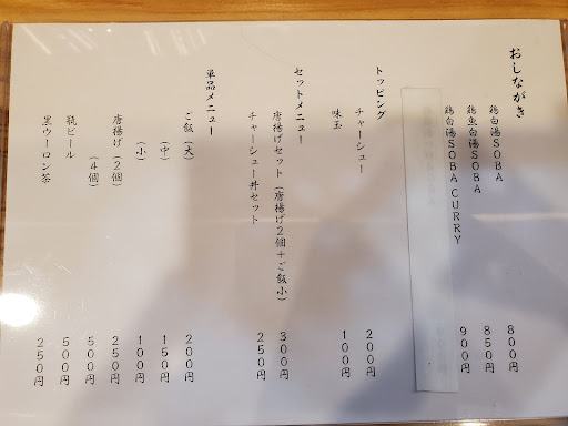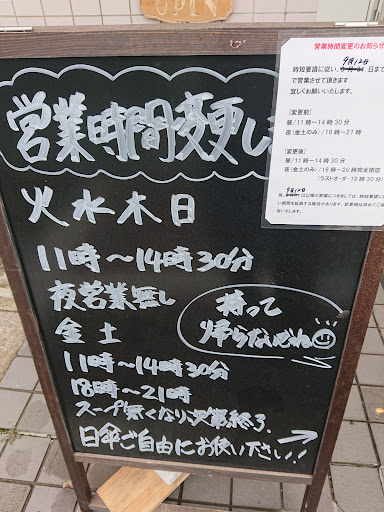 Read more18時半くらいに行って、鳥白湯SOBAチャーシュー丼セットを食券で購入。 大袈裟なくらい低姿勢なサービスで対応はとても良いと思いました。 テーブルに用意されている物も箸、レンゲ、コップどれも使用人数分のみ。 こういう衛生面での気をつけ方もあるのかと感心しました。 毎回用意するの大変だろうな。 まぁでもサービスにこだわってるのかほぼワンオペだからなのか提供スピードは決して早くなく、ラーメン屋にしては少し長く待ったかな。 味はスープはこだわりを感じ良、めっちゃ濃厚って訳ではないけど醤油?とのバランスは良かったかな。 麺は中太麺で固さは普通から少し柔い位でコシはそこまでかな。 メンマも市販のもので味がきつく、チャーシューも特によくある味付けで個人的にはスープの良さをちょっと邪魔してる感じ。 一緒に食べる計算はされてないのかな。 あとはネギが刻みきれておらず連結されておりプロではないのかな?笑 チャーシュー丼も一言でいうなら普通。 スープはアリだと思ったので次は別のを食ってみるかな。 今んとこ白湯SOBAはもう良いかな。 スープ少し塩からっくて飲みきれんかったし。 でもサービスはとても良かったので来たくはなるかな。 退店時も外まで来てお辞儀していましたしね。 ただ、地元客や顔馴染みが多いのか私がいた30分くらいでもよく友達同士の会話みたいなんとか店主?とお客が結構話されていて一見客としては居心地があまり良くなかったですね。 それが気にならないなら全...