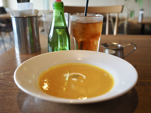 ◆プレートランチ(ドリンク付) 税込 1,550円 本日のメインは豚肉の低温ローストハニーマスタードです。 先ずはスープから出てきました。 カボチャのスープは濃厚で自然な甘味が美味しいです。 程なくしてメインのプレートが登場。 豚肉の他にはバジル風味のポテサラ、蒸し鶏のスイートチリソース、生ハム、パテとクラッカー サラダ、トマト、プチトマト、茄子や葡萄、ヨーグルトまで付いていて賑やかで見た目も良い♪ 豚肉は低温で焼かれてるので柔らかくジューシーでハニーマスタードソースが合います。 厚切りの肉が2枚入ってるので量もちょうど良い。 ご飯は雑穀米で体に良さそうだし野菜もたっぷりでこの店が女子に人気あるのも分かりますね。 バジル風味のポテサラ美味いし、パテは濃厚な旨味、蒸し鶏も美味しくて、ヨーグルトで お口直しできるのも嬉しい。 ドリンクも付いてるのでアイスティーでまったり過ごさせて頂きました。