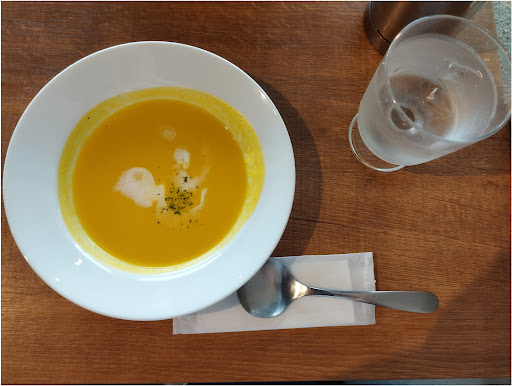 2人席でしたが、スープは飲み終わったらすぐに下げに来てくださいましたし、水、ケーキ、ホットラテ、メインのベーグルサンドイッチ、2人分並べても大丈夫なスペースのテーブルで思ったより快適でよかったです✨