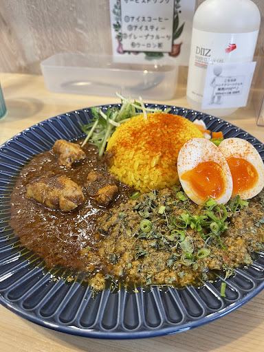 この日は初めての訪問だった為、定番の「グリムジャッカル(チキンマサラ)」と「ポークキーマ」の合いがけに、半熟卵を。 グリムジャッカルの辛さ5を心配したが、亭主曰くスパイスカレーを食べた事ある人なら、そこまで辛く感じないとの事。