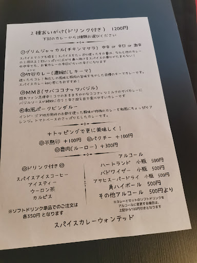 カウンター+2階の個室の店内はこぢんまりとした、飾りっ気のない雰囲気。 店内に香る独特なスパイスの香りが食欲をそそる。 メニューは3種の定番スパイスカレーに、週替わりのカレーが1種とトッピングのみ。 ご飯の大盛は無料で、好きなカレーを2種選んで1,000円という分かりやすい価格設定。 ドリンク1杯無料なのが嬉しい。