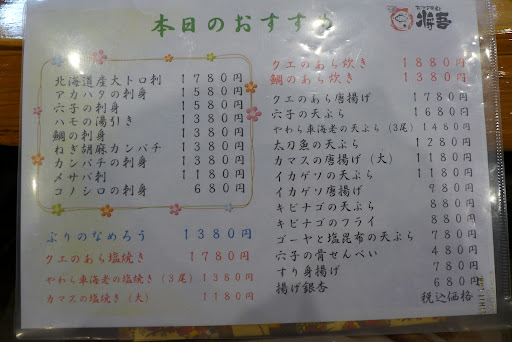 Read more天草は、懐の深い島だ。海に囲まれた豊かな漁場からあがる魚や海老、海藻、牛も勿論、天草大王に至まで飽きる事のない豊かな、本当に豊かな食材の天国な島である。そして、それらの素材の味を余す事なく引き出す料理人が数多くいる。 ここ「おさかな食堂将吾」の主人もその1人。 店を出して10年、まだ、30代半ばだと言うのに、魚を扱わせたら半端ない能力を発揮する若き料理人。 特に、鯛のあら煮は、絶品だった。出汁の味付けは勿論の事、絶妙な火入れは、天下一品!である。煮付けらたあらの身がぷりっぷり、さしみより生きているんじゃ〜ないか?と思わせる。しかも、隅々まで一つ残らずウロコを取るなど、丁寧な仕事をなさる。私が人生で食べた鯛のあら煮で間違いなくNo1‼️である。このあら煮をアテに呑む天草の焼酎との相性も抜群である。刺身も1人前、¥1350-で7〜8品をドンと盛ってくる。。 驚いた。。 ただ、ただ、驚いた。。 家の隣りにあったら、100%、365日居座る店になるはずだ。。 また、彼を手伝う美人お母様にも脱帽だった。 店じゅうを明るくするその笑顔は、店のライトが要らないんじゃない?かと思うほど(笑)、客たちを癒し、笑顔にして行く。。 多分、天草じゅうのどんな高級なホテルのレストランで頂く食事より、この小さな小さな居酒屋の愛と、笑顔と、心意気と、味には、勝てる所はないと思う。(因みに私は、その高級ホテルの食事にサジを投げ、、こちらにお邪魔してしまった)本当にご馳走さまでした。 また、必ず伺いた...