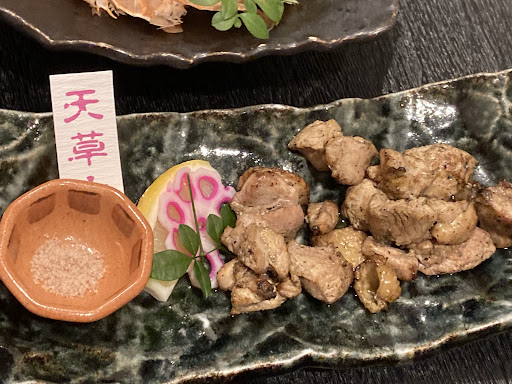 メニューのおススメにあるものは全て間違いないと思います、自家製すり身天ぷらはお土産に良くある甘い物ではなく自家製で良くあるフワフワでもなく硬めの仕上がりで熱々の旨味の塊となってます。お刺身の旨さは言うまでも無し、一皿一皿の量が多めなので注意が必要。天草大王は出て来るまでかなり時間掛かったけど丁寧に焼いてくれてるんだなと思いました。お店の外でタバコを吸ってると地元の方に声を掛けて頂いたり、魚が旨い理由は地形と海流にあるそうで、まず北側に位置する有明海の豊かさが半端ない。満ち引きの激しさ日本一、塩が引けば干潟に陽が当たりプランクトンが爆増する、天草自体も小さな湾が多く。そこにミネラルたっぷりな3本の河川が流れ込み養分を湾内に閉じ込める、早崎瀬戸を始めとする急峻な海流で良質な餌を食べた魚が泳ぎまくり味が締まると言った寸法らしいのです。鳴門の鯛みたいなもんですね。こんな地形ぱっと思い浮かべても能登半島や大間あたりしか思い浮かばないのでと...