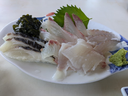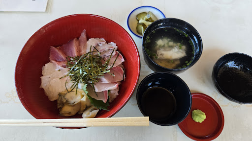 Read more2024年夏休み旅行にて。 漁港のすぐ近くにある店舗です。様々なサイトの口コミを見てお伺いしましたが、とてもレトロな店舗です。1階には生簀などがあり、飲食が出来るところは2階になっています。ご夫婦で営んでいらっしゃるようで、元気な声で出迎えてくださりました。 ものすごく暑い日にお邪魔しましたが、残念ながらクーラーが効いておらず…。たくさんの扇風機とよく通る風でなんとか過ごすことが出来ました。 店内にはご主人をイメージした?オリジナルTシャツがかかっていたり、アットホームな雰囲気でした。 メニューもとてもシンプルで海鮮丼か刺身定食(どちらも1500円)とのこと。海鮮丼にはこれでもか!と様々な種類の魚介類がのっていました。どのような種類のお魚がのっているのかの説明がなかったため、何を食べているのか不明なのもドキドキお楽しみ気分でした。 下のお米は酢飯ではなく、普通の白米でしたが、九州ならではの甘く濃いめのお醤油にはその方が良いのかもしれません。一緒についてきたお漬物やお吸い物が美味しかったです。お吸い物はしっかりとお魚の切り身が入っていて、出汁としてではなくしっかりと身を頂く事ができてお得な気持ちになりました。 刺身定食にはお刺身、ご飯、味噌汁だけでなく、煮魚もついており大変驚きました。お刺身(こちらも何の魚を食べているかは不明)、煮魚が...