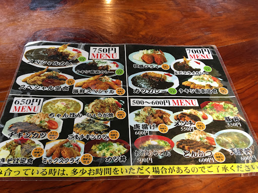 マングローブパーク周辺では人気の高い定食屋さん。 ボリュームたっぷりでリーズナブルな店として地元の方に愛されてる店。 初めての訪問でした。豊富なメニューに圧倒されました。 値段は近頃の原材料高騰で値上げした様子。 店内も広く手前に4人~6人掛けられるテーブル席が4つ。 奥は座敷スタイルになってました。 広い店内を1人でサーブしており大変そうだな⁉と感じました。 注文したのはカツカレー。 カツカレー探訪を始めたので最初の一品はこれで決まり! カレーは市販のルーを使ったタイプかと思ってましたが、少しスパイシー感を感じたので独自のブレンドがされているようです。 カツも満足のいく大きさで、野菜もついてたのはビックリ。 900円と定食と変わらない値段ですが、満足のカツカレーでした。 弁当を注文して取りに来るお客さんも多く地元の人に愛されてる店だなぁ。と改めて思いました。 末長く続いて欲しいですね。 ちなみに人気ナンバーワンはチキン南蛮定食とメニ...