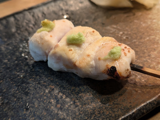 鹿児島薩摩地鶏を熟成させて、 焼きは全体的に炭の香り移して、 閉じ込めるようにしっかり焼き。 塩気は強めで、素材の甘みが感じられる。 周りと合わせて串提供なので、 一人でお酒飲めなかったら、ちょい待つかも。 アルコール飲まなかったので、今回は7400円ぐらい