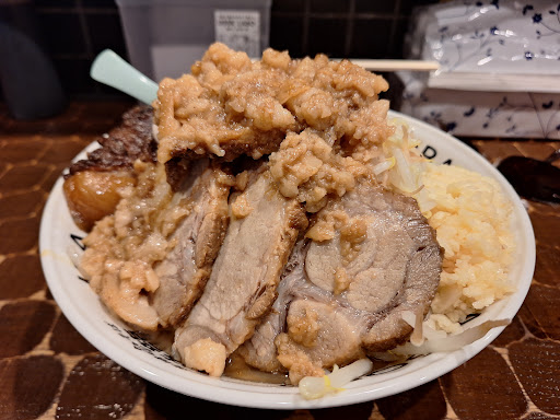 Read moreR6.11 豚そば(豚2枚)(麺250g) 麺大盛(100g 100円)×2 豚1枚(100円)×2 麺バリカタ ヤサイ増し アブラ増し ニンニク増し増し カラメ有 土曜12時00分現着 食券先買 中待ち5人 外待ち4人 に連結 店内 カウンター9席のみ 店長案内で 外から中へ そしてカウンターへ 12時25分着席 食券置き トッピング用紙に○付け ヤサイとアブラ 増し増し ない カラメ有無のみ 全マシマシにしたいが できぬ ○付け後 食券の横へ カネシ 卓上にある 食券とか回収時 麺バリカタ 聞いたら できた 食券回収後 麺計量 茹で開始 バリカタは 1分程度遅く茹で開始 ワンオペのため 完全ロット制 客入に応じ1ロット3人~6人幅ある模様 我ロット3人 トッピング用紙提出済につき コール要求なく 同ロット3人 同時着丼 他2人の丼 小さい ちゅうか普通丼 焦る ヤサイ盛りマシ程度 やっぱマシマシがいいな アブラ味付き マシマシレベル ニンニクもマシマシよき ヤサイはシャキ アブラと和わせ うま って 頂上アブラに隠された ぶた発掘 元々豚2枚 追加 豚1枚×2 計4枚のはず 着丼時 大きいスライスぶた3枚 ごつい端ぶた1個 の4つ確認済み に加え 隠されたぶた それも他と変わらぬスライスぶた で計5つ 店長 ありがとう その ぶた ホロやらかい 赤身多く 時々歯応え 香辛料 効いてるのか 特徴ある味付け 麺 理想的 中太平打ち縮れ オーション小麦感強く ワシワシ食える もうちと 硬くとも良いが この麺 好き 麺大盛×2 計450gも足りぬ スープ 微乳化 カネシしっかり 液脂層 増しアブラ塊 混ざり うまい 甘さ強くない メグジ似との印象 個人的には 甘い関内好きだが 次ロット客 着丼 ロット乱さぬ ギリギリまで スープ堪能 ここ 二郎求める諸氏 大満足できる店 かと