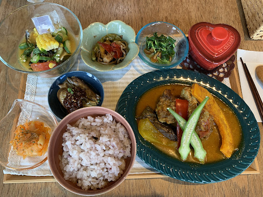 これだけの種類のものが今回は、いただくことができました。 カレーはグルテンフリーで、手作り感満載のスパイスカレー。 このカレーに入っているスパイスソーセージも全て手作りとのこと。 残ったカレールーは雑穀米にかけて楽しみました。