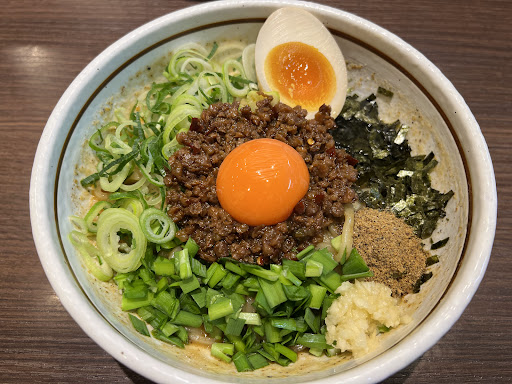 ・おすすめ ・全部のせの欲張りスタイル(のり2枚/味玉1個/ チャーシュー2枚/メンマ10本) ・追い飯(無料) ・世界に愛され100万人をうならせた味 ・台湾ミンチ(唐辛子とニンニクを効かせた 醤油味のピリ辛ミンチ) を極太麺に乗せた汁無し麺の一種 ・代表的な具は 生の刻んだニラ/ネギ/魚粉/卵黄 ・自家製麺 ・麺は湯切りをせず麺棒でかきまぜ傷をつけ 粘りを出すと同時に甘みも増している ・11:05食券購入し11:20提供