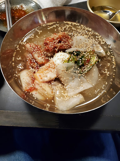 Read more晩御飯に訪問しました。 七時半頃に入店。 店員さんはとても気さくで明るい方でした。 カウンター席に案内されました。 注文したのは韓国冷麺、チーズブルダック、韓国ラーメン、キンパ。 全体的に値段は高めの印象です。 でも、韓国冷麺はとても美味しくてスープの中に凍らせたスープのか溜まりも入っていて最後まで冷たく頂きました。 麺は細い蒟蒻のようでしたが、食べてみると食べやすくて美味しかったです。 やっぱりスープがとても美味しくて酸味が丁度良くやみつきになりそうでした。 主人はチーズブルダックがお気に入りで、甘辛とニンニクのタレがお気に入りでした。 韓国ラーメンは辛拉麺のような味で中に野菜が入っていました。 全体的に価格は高めですが、美味し...