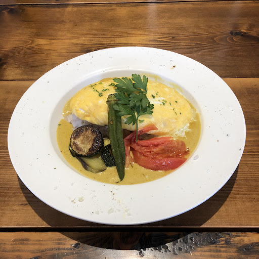オムライスにカレークリーム、 今まで見たことない組み合わせですが、 中のライスはケチャップライスではなく バターライスなので相性抜群。