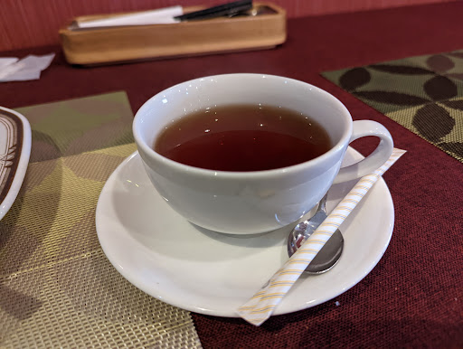 デザートは シフォンケーキと桃のタルトと… あと1つが説明なしのためわからないですが タルトは結構しっかり目の甘さでこの薄い 一切れでも満足感がありました。 ドリンクの紅茶と一緒にいただきました。